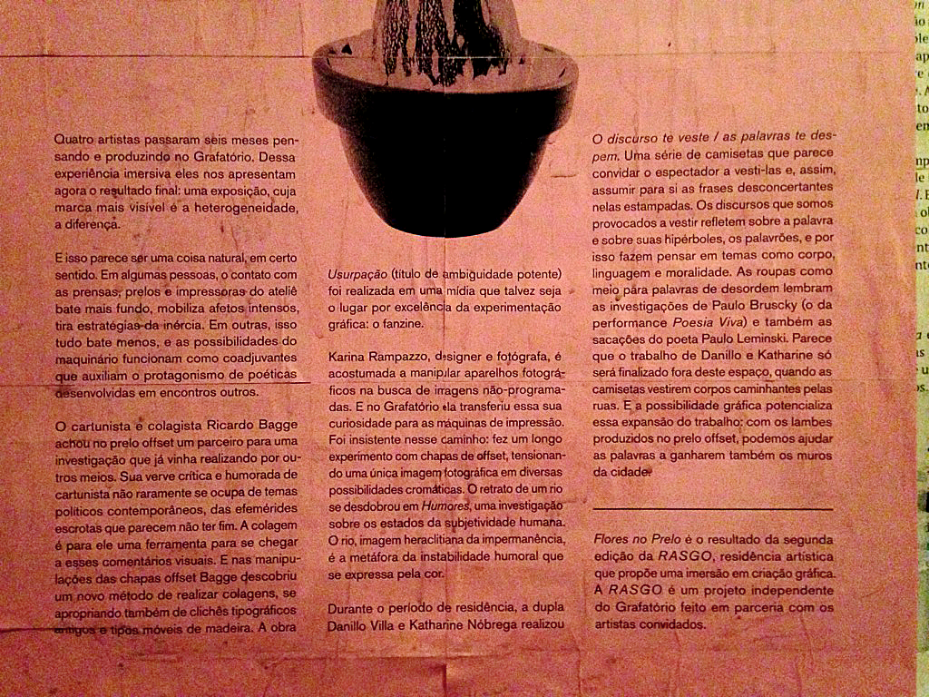 Quatro artistas passaram seis meses pensando e produzindo no Grafatório. Dessa experiência imersiva eles nos apresentam agora o resultado final: uma exposição, cuja marca mais visível é a heterogeneidade, a diferença.